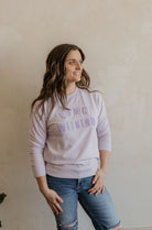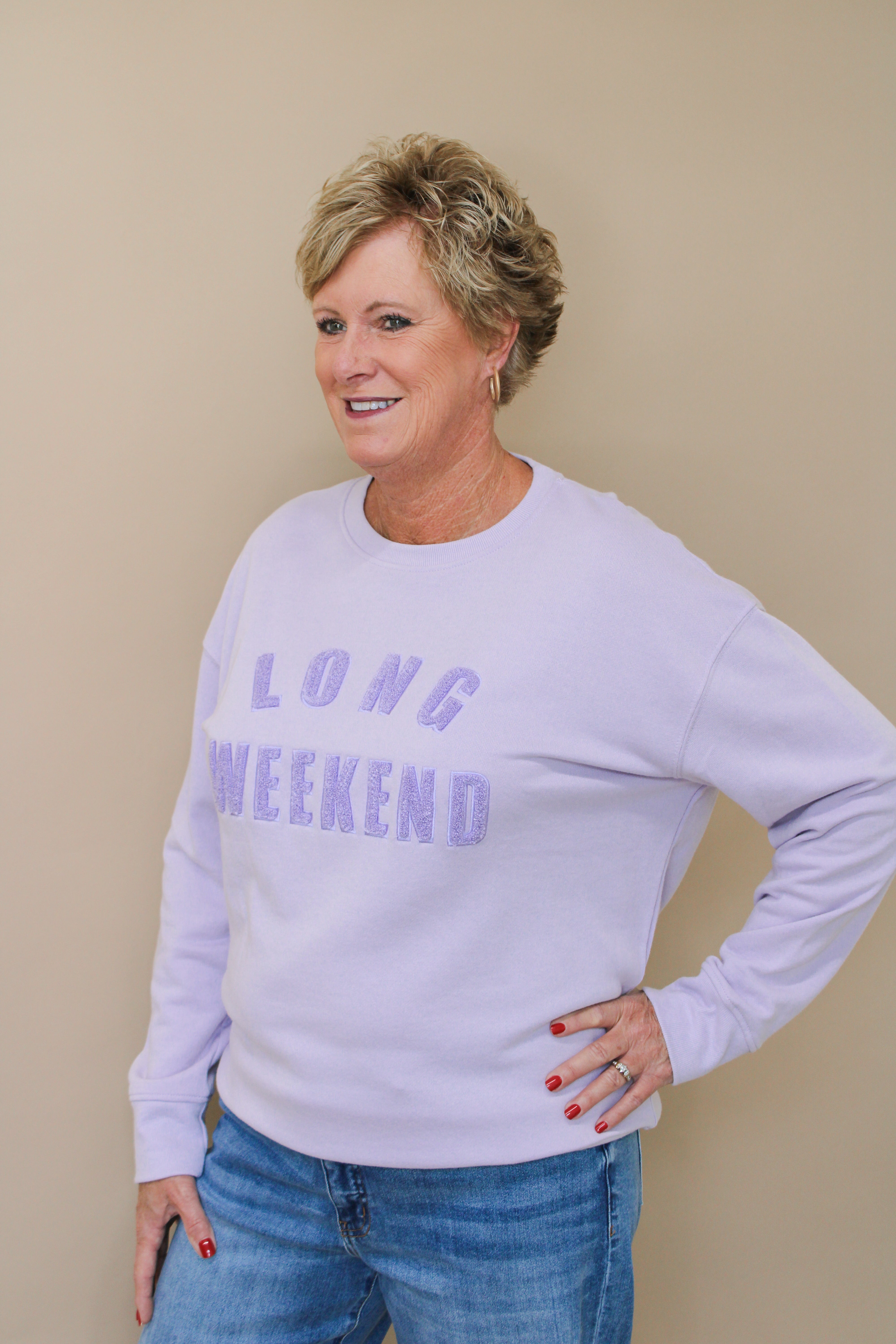 Lilac colored crewneck sweatshirt with Long weekend embroidered on it