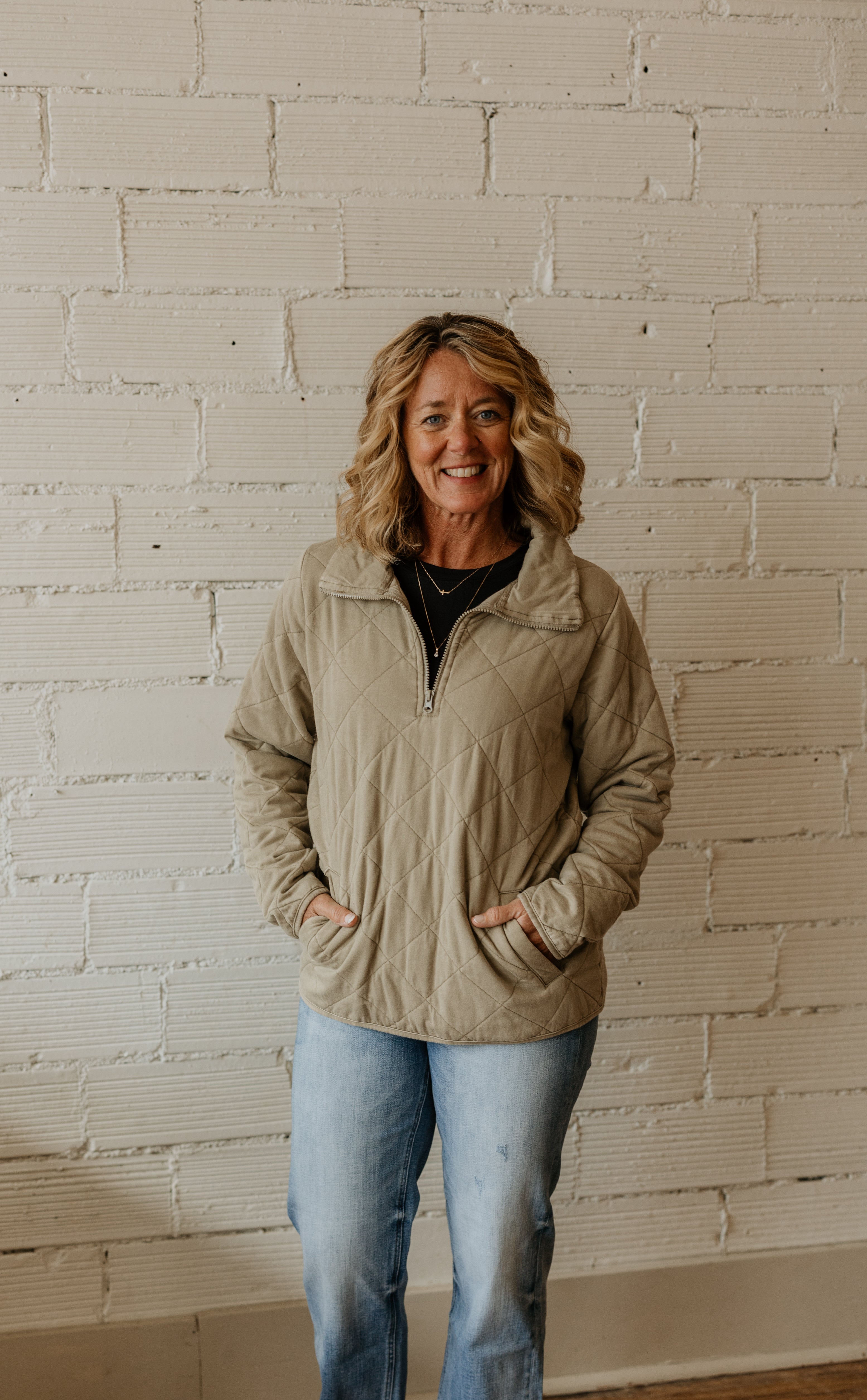 Get cozy with the LAIKE MINERAL-WASHED PULLOVER! With a quilted half zip design and a versatile taupe color, this pullover is perfect for any chilly day. Stay stylish and warm all at once.